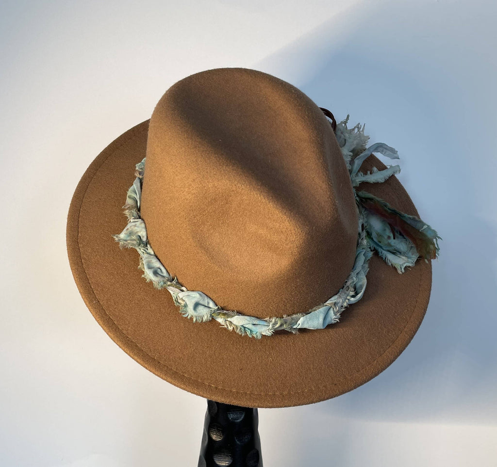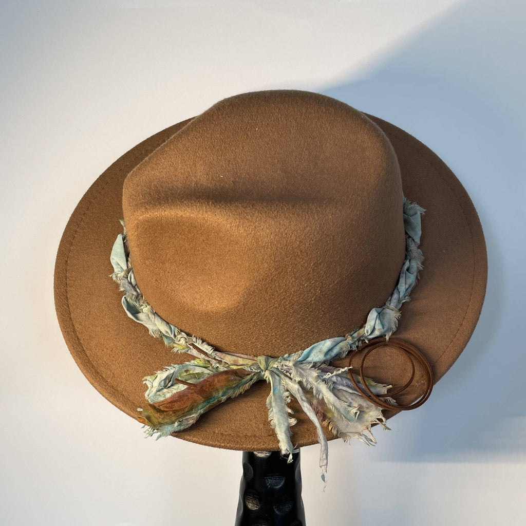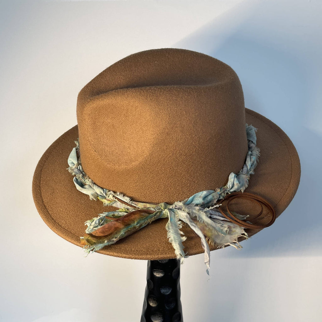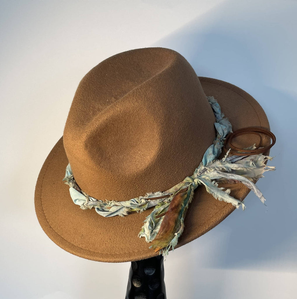 Transform your everyday hat into an artisan statement piece with this handcrafted Fat Braid band in Gentle Mercies. Meticulously constructed from hand-dyed sari silk, curated fibers, and buttery suede cord, this pre-tied accessory requires no adjustment—simply slip it on and go. The richly textured, vintage-inspired materials evoke understated elegance, bridging the gap between refined casual wear and western-influenced style. A refined touch for those who appreciate thoughtful, handmade details.