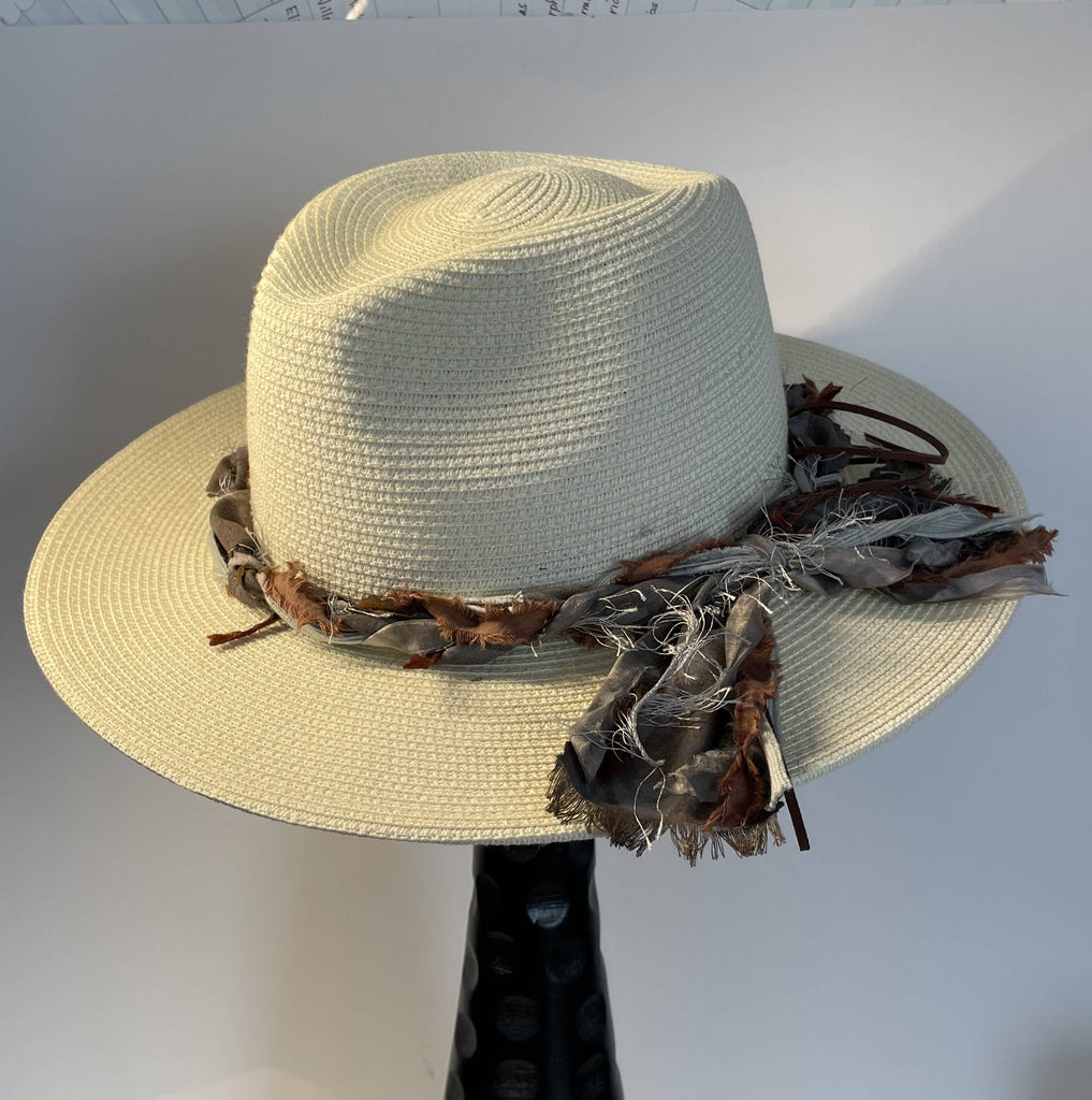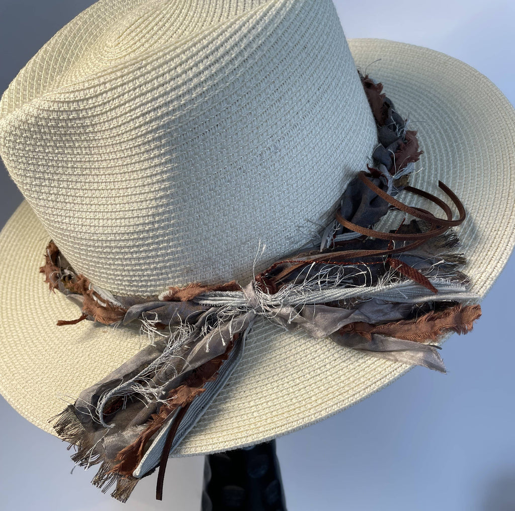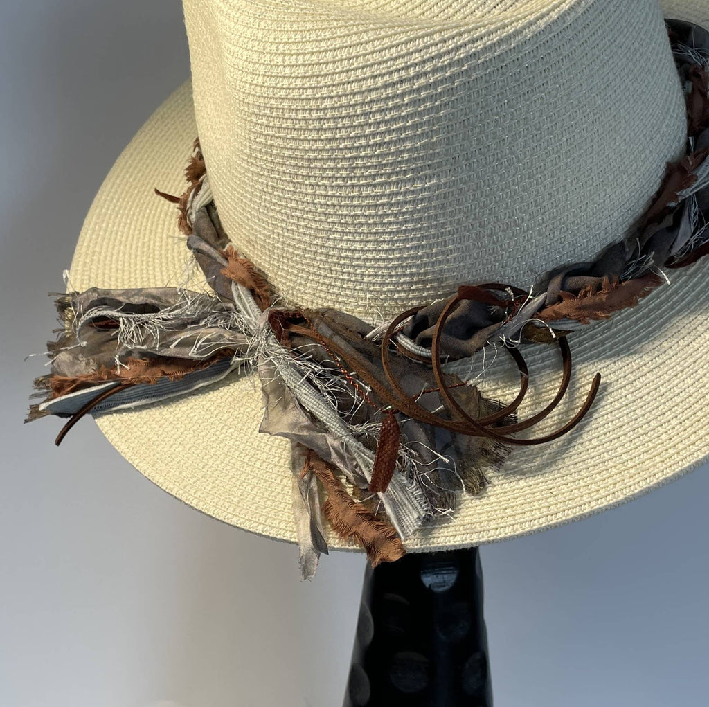 This handcrafted Fat Braid hat band in Weathered Tin combines premium hand-dyed sari silk, artistic fibers, and buttery suede cord into a refined accessory. Pre-tied for immediate wear, each piece showcases the patina of aged materials that evoke understated elegance. Perfect for elevating everyday hats into curated focal points, it bridges casual and western aesthetics with effortless sophistication. An investment in artisanal craftsmanship that adds depth and character to your personal style.