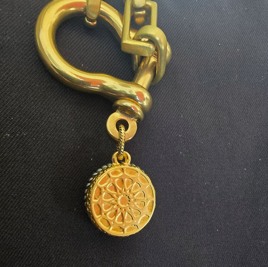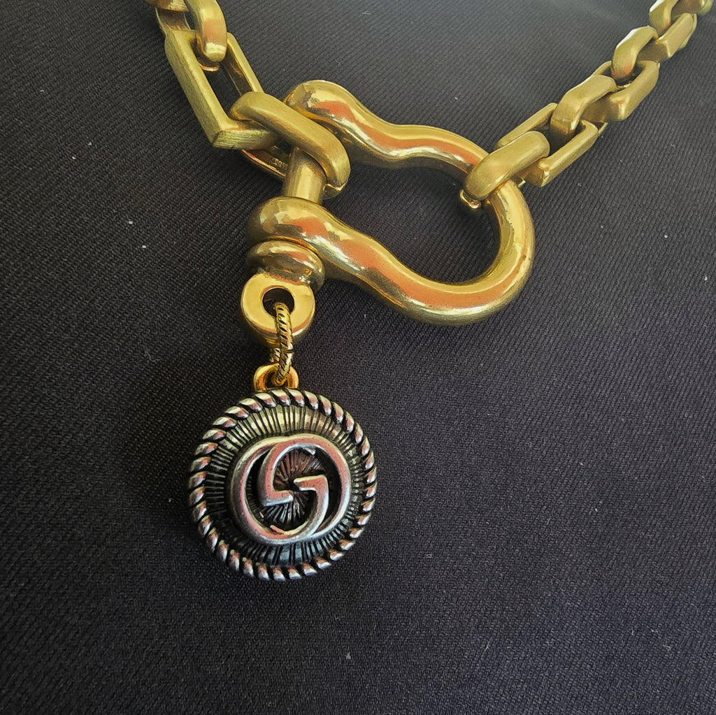 Elevate your everyday elegance with this distinctive necklace featuring an authentic vintage Gucci button as its centerpiece. Suspended from a refined brass chain, this piece merges timeless luxury with artisanal craftsmanship. The iconic button—a symbol of heritage and prestige—becomes a wearable statement of sophistication. Perfect for those who appreciate curated, one-of-a-kind accessories that tell a story. A handmade treasure that transcends trends and celebrates the art of fine jewelry.
