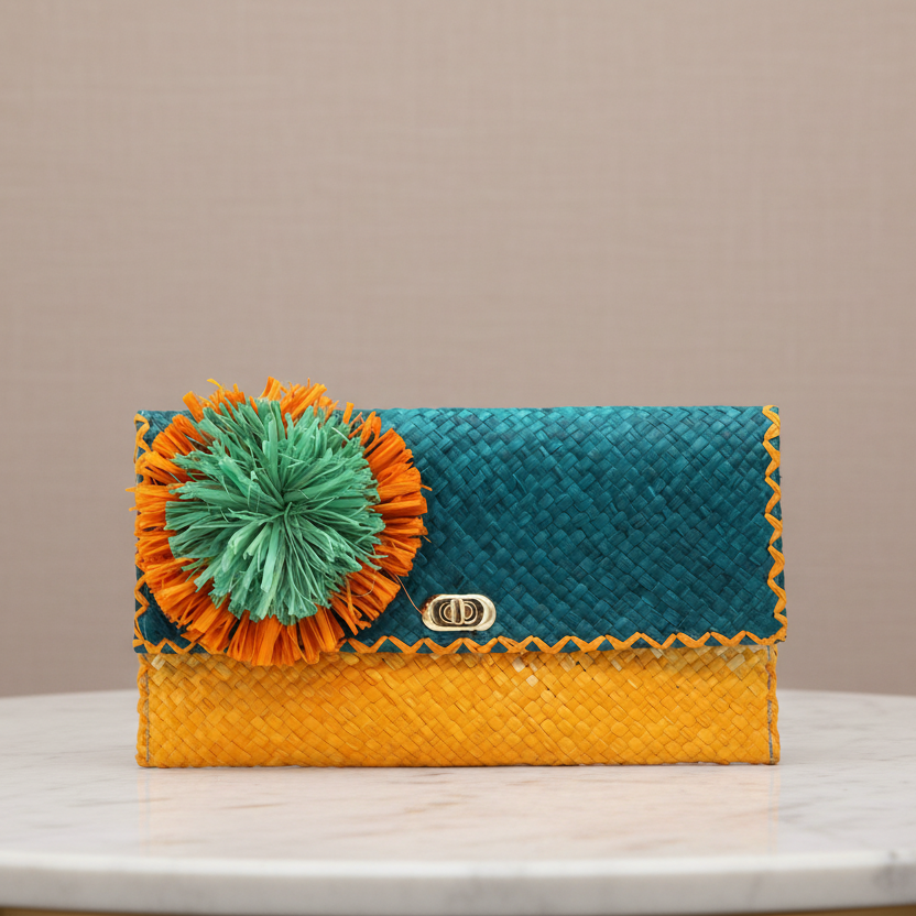 Crafted from hand-woven raffia with a stunning dip-dyed ombre design, this straw clutch blends artisan beauty with everyday practicality. The fabric liner, inside pocket, and secure turn-lock clasp keep your essentials safe, while the one-of-a-kind pattern makes it a conversation starter. We especially love the flower pouf!