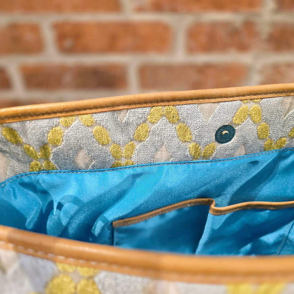 Color: Bag - Cream background with Seafoam and Chartreuse Green Embroidery and Teal Interior. Strap - Tan Italian Leather.