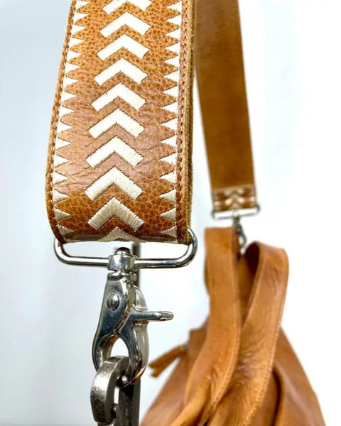 Enhance the appearance of your handbag with our handcrafted adjustable wide leather embroidered shoulder strap, featuring embroidered archer arrow detailing. Our artisans have crafted this strap from 100% full-grain leather, ensuring a unique look with natural variations in grain texture and shading, which are the hallmarks of high quality.