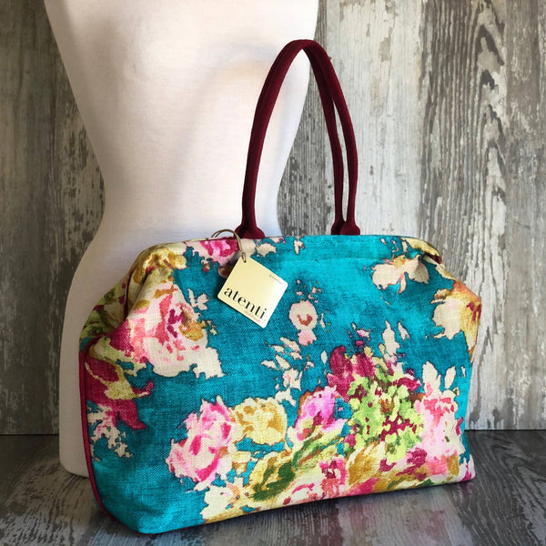 The Blossom Blue Pioneer is a one-of-a-kind heirloom handbag designed for those who appreciate timeless elegance. Crafted with meticulous attention to detail, this upscale accessory seamlessly blends classic style with unique character, making it a distinguished addition to any collection. Its refined silhouette and exceptional craftsmanship ensure it stands apart, embodying sophistication for the modern connoisseur. A robust texture cotton linen blend printed with a bold floral watercolor design.