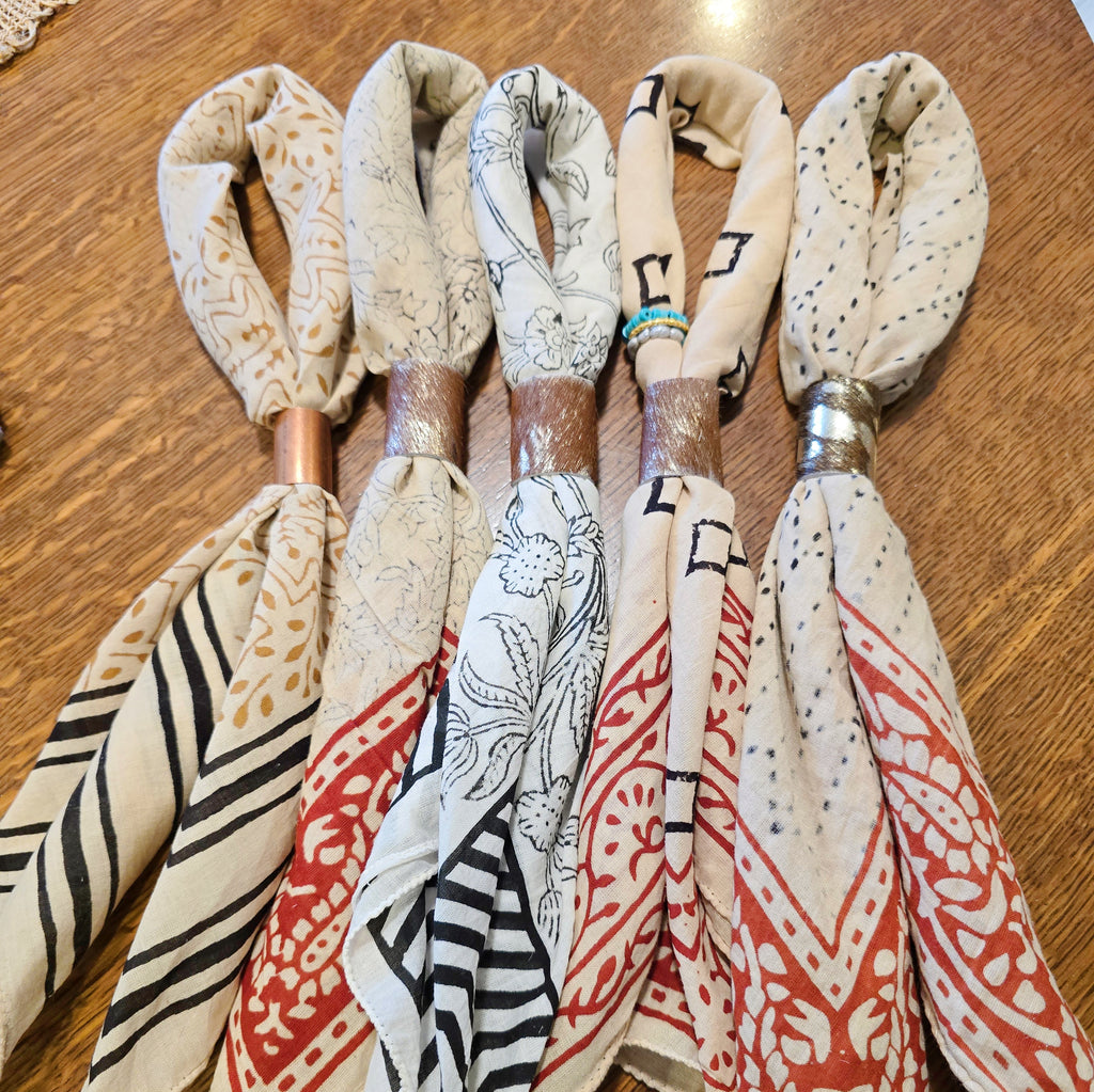 Boho mixed print cotton bandanas with fashion slides. Select from genuine cowhide, copper, or jewels.