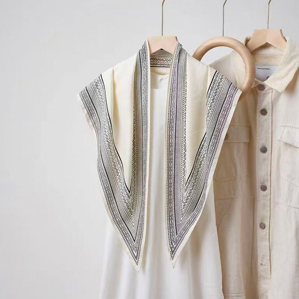 Enjoy our Border Triangle Silky Scarf. The refined border print creates a polished frame that elevates any ensemble, while the lightweight silk construction ensures graceful movement and year-round versatility. Whether layered for warmth or worn as a statement accent, this scarf delivers timeless sophistication with effortless style.