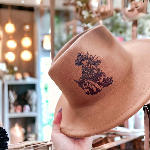 Experience Western fashion with a touch of elegance with our unique and beautifully adorned with our burnt cowgirl and horse design.