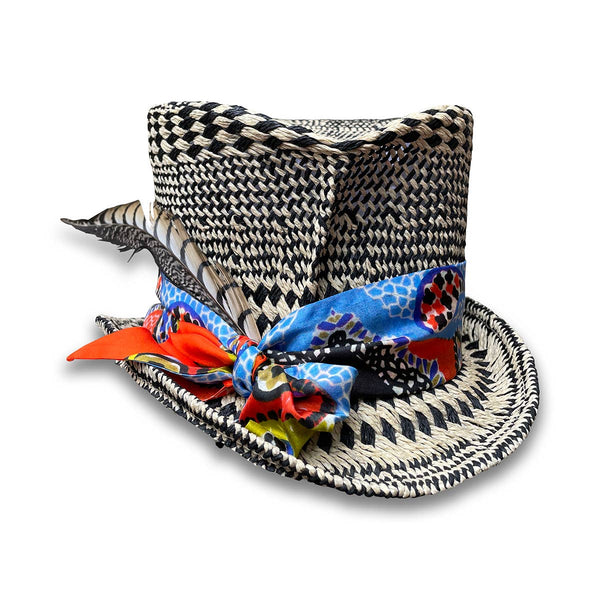Our designers typically use this straw for fedoras or boaters but then they thought: 'Why not a top hat?' And oh my goodness it's amazing! The bold print lent itself so well to the top hat shape and then add a silk twilly scarf for a delightful pattern mix. A pheasant tail completes the look of this charming piece.