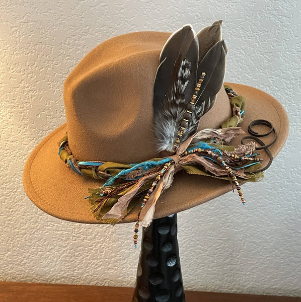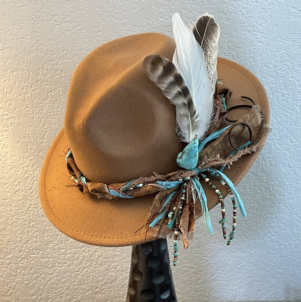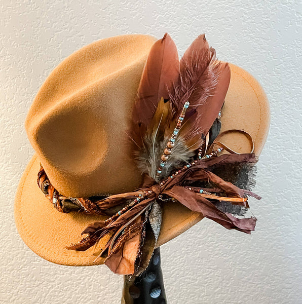Dress up your cowboy hat with this premade Fat Band Feather and Pin Set. Simply add the handband adorned with feathers and pins for a unique and fun statement piece. Take your hat game to the next level with this beautiful hat accessory. Yeehaw!