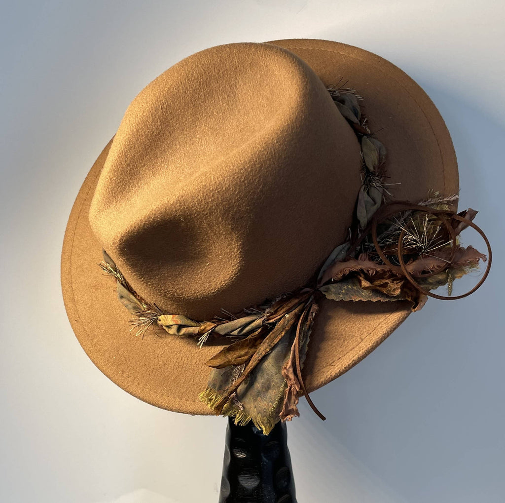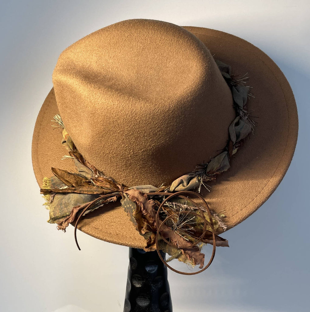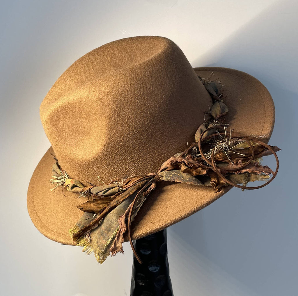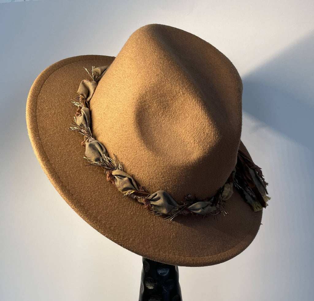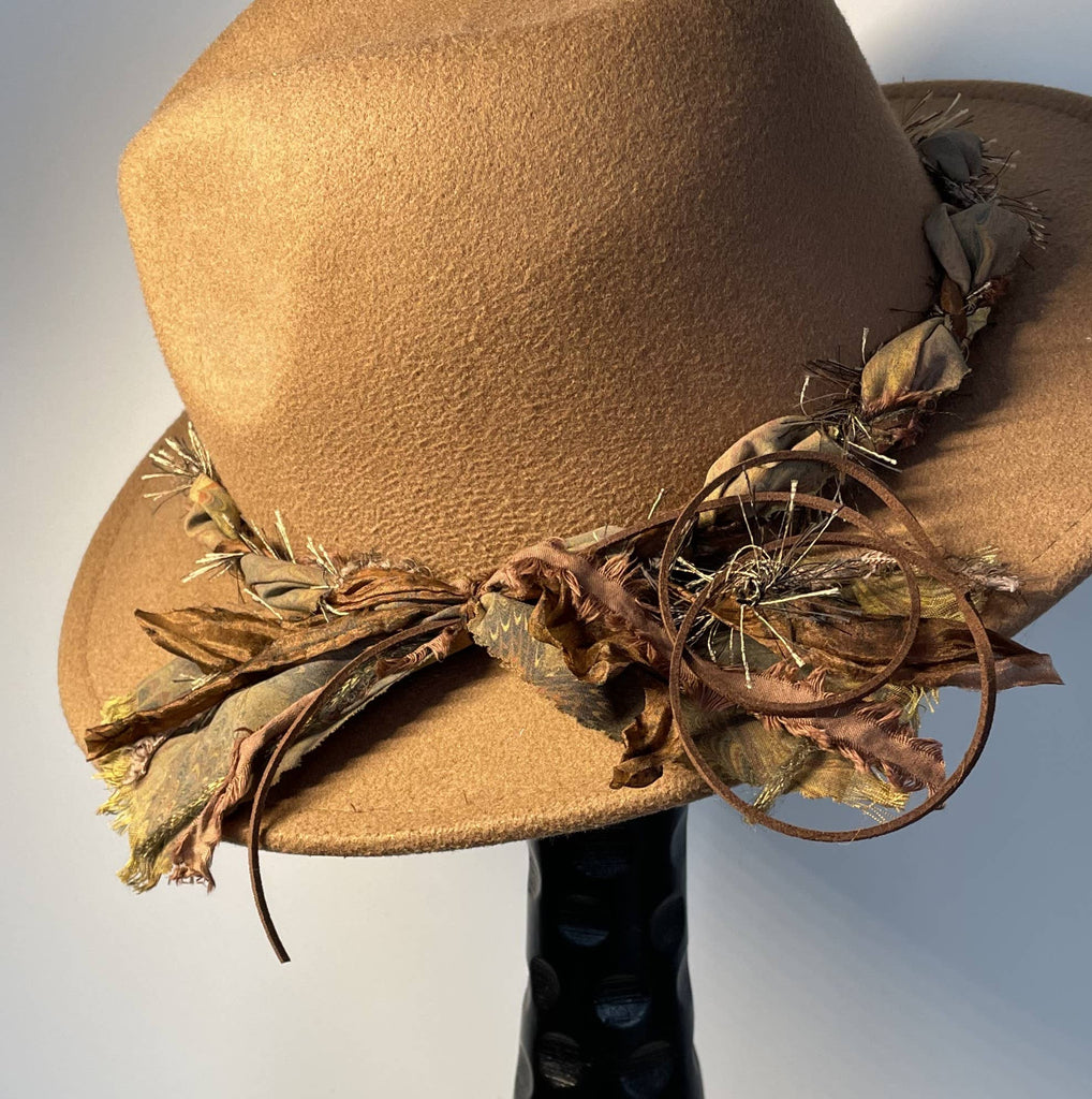 This handcrafted Fat Braid hat band in Prairie Crocodile combines hand-dyed sari silk, artistic fibers, and buttery suede cord into a pre-tied accessory that demands attention. Each artisan creation showcases vintage-inspired textures and earthy tones, effortlessly bridging bohemian elegance with western sensibility. Transform your everyday hat into a curated statement piece with this refined, ready-to-wear embellishment.