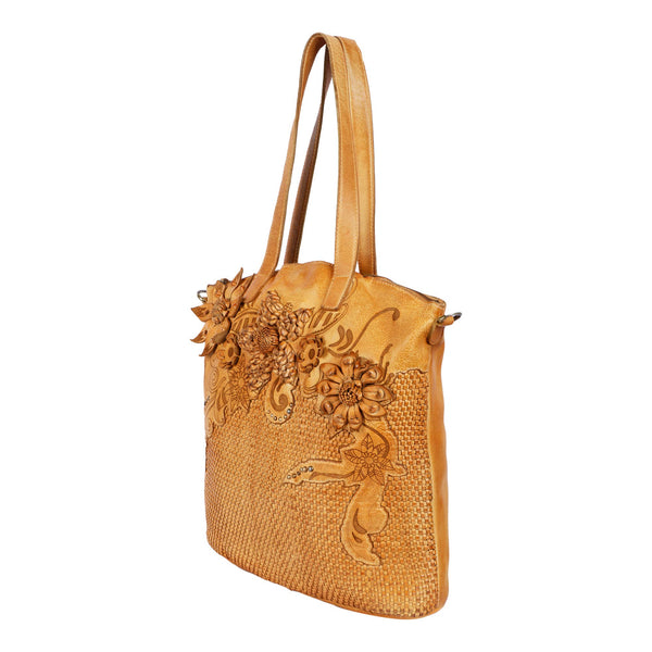 Handcrafted Genuine Leather • Exterior features handmade leather flower and woven panel • Double shoulder handle • Adjustable/detachable crossbody strap • Brass feet • Cotton lining • Top zip closure • Inside zip pocket, open slip pockets, key ring • Back zip pocket • Cotton dust bag •