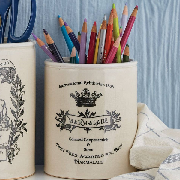 This vintage-inspired crock is just begging to hold your kitchen utensils or your collection of colored pencils. Inscribed with old-world prize-winning marmalade, it envokes a french crock feel.