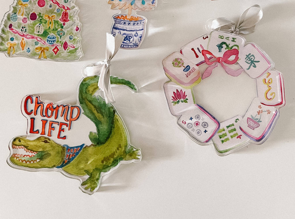 Celebrate the season with a splash of artistic flair! This one-of-a-kind ornament transforms hand-painted mahjong tiles into a stunning wreath design. Each tile showcases delicate watercolor details, carefully arranged in a cheerful circle that marries cultural heritage with holiday spirit. Crafted from durable acrylic with a glossy finish, it's light enough to hang anywhere—your tree, a gift package, or displayed year-round as a conversation starter. A playful twist on traditional ornaments that brings joy to any space.