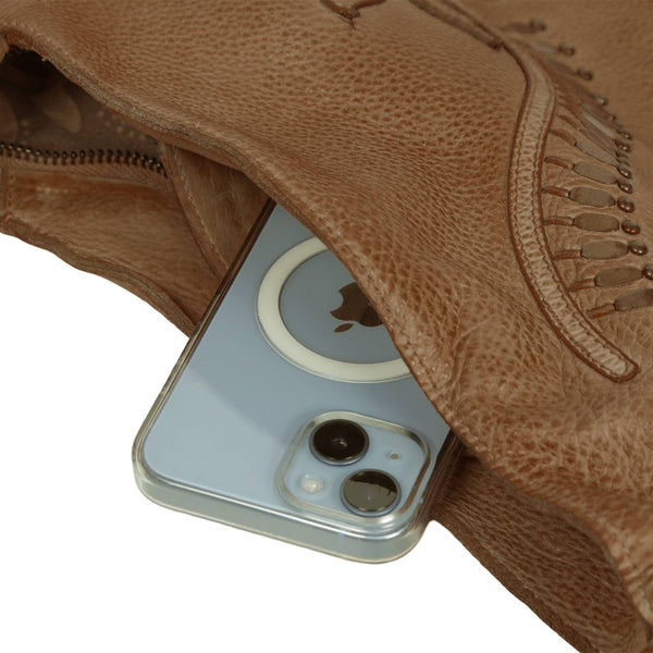 • Exterior features leather applique flower and studs • Soft shoulder handle • Cotton lining • Top zip closure • Inside zip pocket, open slip pockets, key ring, interior hidden smart phone pocket • Back zip pocket • Cotton dust bag •