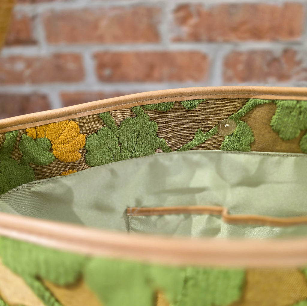 Color: Bag - Golden background with Green and Gold Embroidery and Light Green Interior. Strap - Tan Italian Leather.
