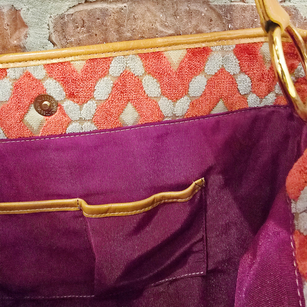 Color: Bag - Cream background with Orange Print and Wine Interior. Strap - Tan Italian Leather.