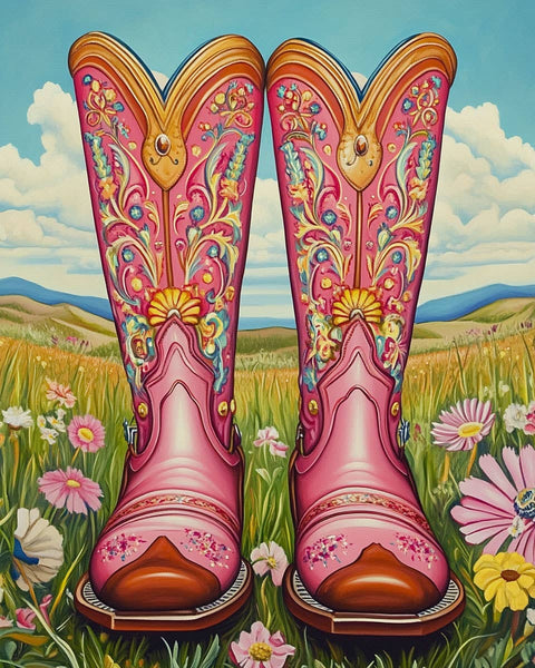 Infuse your space with a touch of modern cowgirl charm with our Pink Cowgirl Boots Wall Art Print. This upscale ranch house inspired piece will elevate any room with its sleek design and stylish vibe. Show off your love for the western lifestyle with this beautiful and unique artwork.