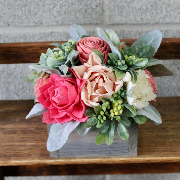 This handmade wooden floral arrangement features eco-friendly sola wood flowers, hand dyed in vibrant pinks and ivory. The greenery and white filler details are high quality artificial materials.