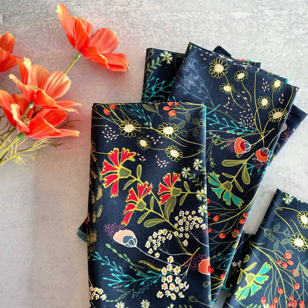 A beautiful print in navy blue with pops of coral, teal, lime, and a bit of pale pink. Super soft and easy to care for.
