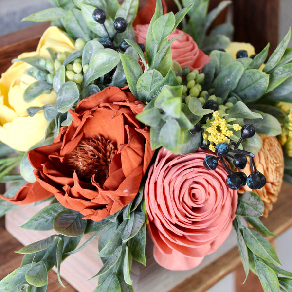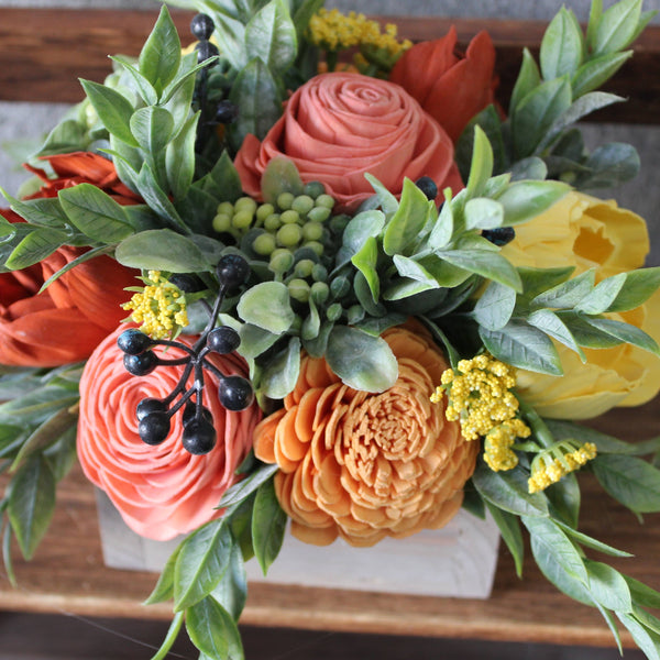 This handmade wooden floral arrangement features eco-friendly sola wood flowers, hand dyed in vibrant coral, rust orange, peach, and yellow. The greenery and filler details are high quality artificial materials.