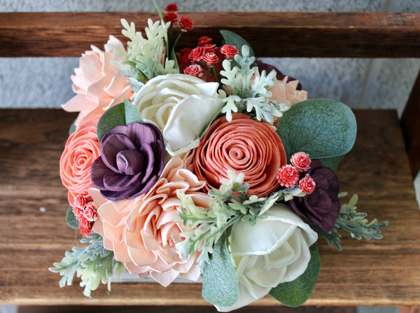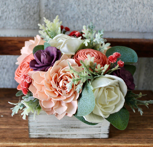 This handmade wooden floral arrangement features eco-friendly sola wood flowers, hand dyed in vibrant coral, rust orange, peach, and yellow. The greenery and filler details are high quality artificial materials.