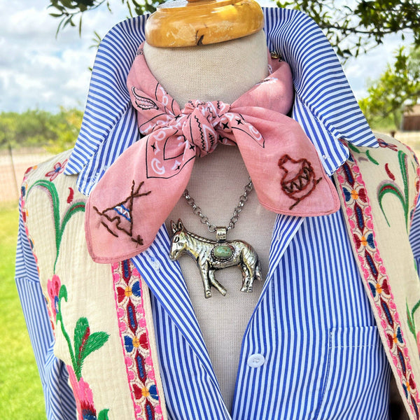 Elevate your rodeo style with the Zuni Embroidered Bandana. This modern cowgirl accessory adds a touch of class to any outfit, while showcasing expert craftsmanship from the USA. Stand out in the arena and support American made products with this upscale bandana.